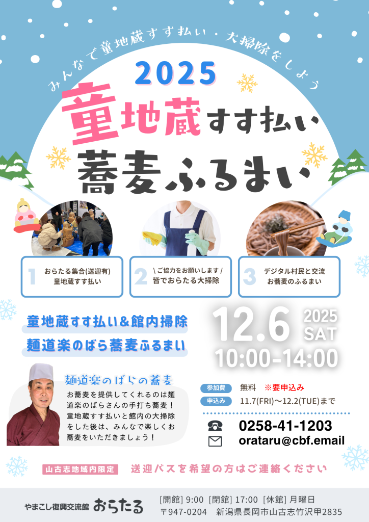 2025童地蔵すす払い&蕎麦ふるまい参加者募集! 投稿日: 2025年11月23日 投稿者: orataru_admin 12/6(土)毎年恒例✨『童地蔵すす払い&蕎麦ふるまい』参加者・送迎希望者お申込み受付中! 今年も童地蔵すす払い&蕎麦のふるまい開催決定!!👏✨ 中越地震の倒木から掘り出された山古志復興のシンボルである童地蔵 恒例のすす払いと大掃除をした後は、麺道楽のばらさんの蕎麦をみんなで一緒に食べましょう! ※送迎は山古志地域内に限ります