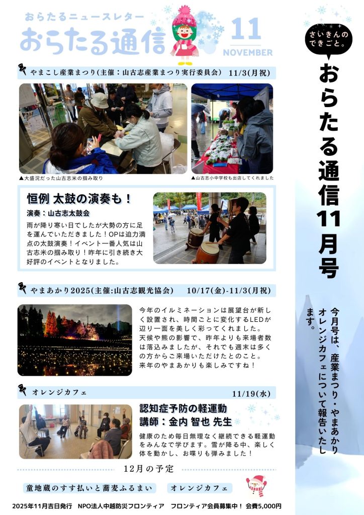 おらたる通信【11月のできごと】 投稿日: 2025年11月27日2025年11月27日 投稿者: orataru_admin おらたるのスタッフを中心に、11月においての山古志の取り組みをご紹介します! 11月号は、産業まつり、やまあかり、オレンジカフェについて⛄